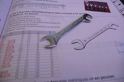FACOM : Clés à fourches micromécanique : le manche court et la grande finesse des têtes permettent d’intervenir dans des espaces très réduits.Les têtes inclinées à 15° et 75° permettent d’intervenir sur des écrous inaccessibles avec une clé standard.Dimensions en pouces : de 3/16 à 11/16.Présentation : chromée satinée.